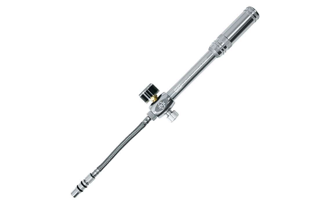 A must-have: the small, handy SKS MSP (mountain suspension pump) suspension pump should be included in any touring backpack. The flexible steel mesh hose can be unscrewed from the pump barrel for very compact travel. The maximum pressure of the aluminium bicycle pump is 20 bar.