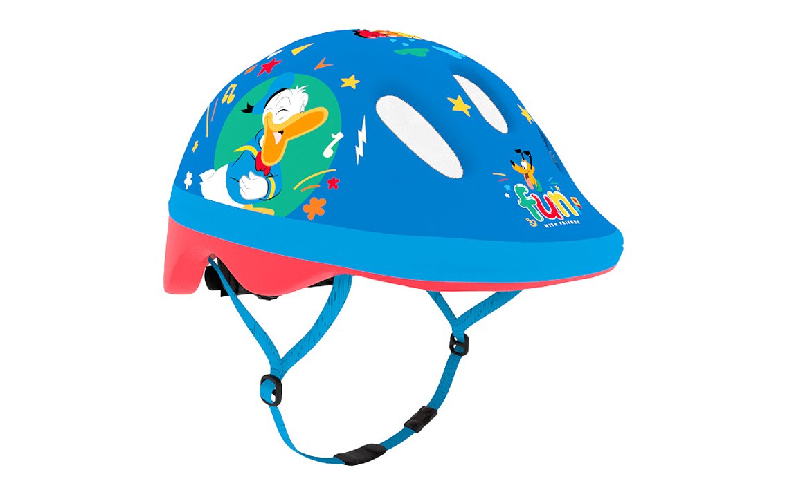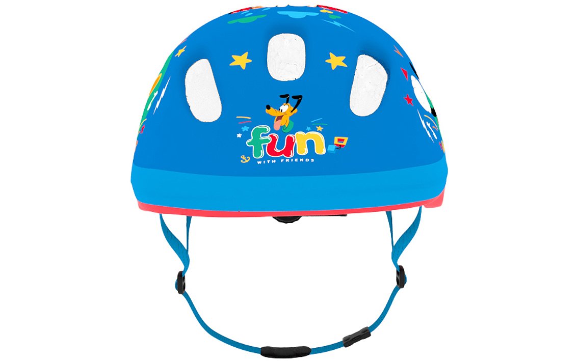 A safe, high-quality helmet, XS 44-48 cm, designed for the youngest riders. Fits well when teaching a child to ride a bike and other vehicles. It will provide comfort when the child is travelling in a basket seat on your bike. Outside helmet is made of matte PVC and decorated with characters from Disney Mickey. Inside is made of the impact absorbing EPS foam. Helmet is equipped with adjusting knob to adjust the helmet to the baby’s head, straps on both sides clipped under chin with a buckle with a soft pad. There are 6 ventilation holes in the shell of the helmet.