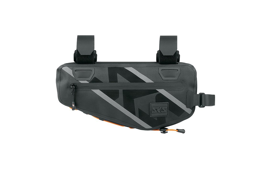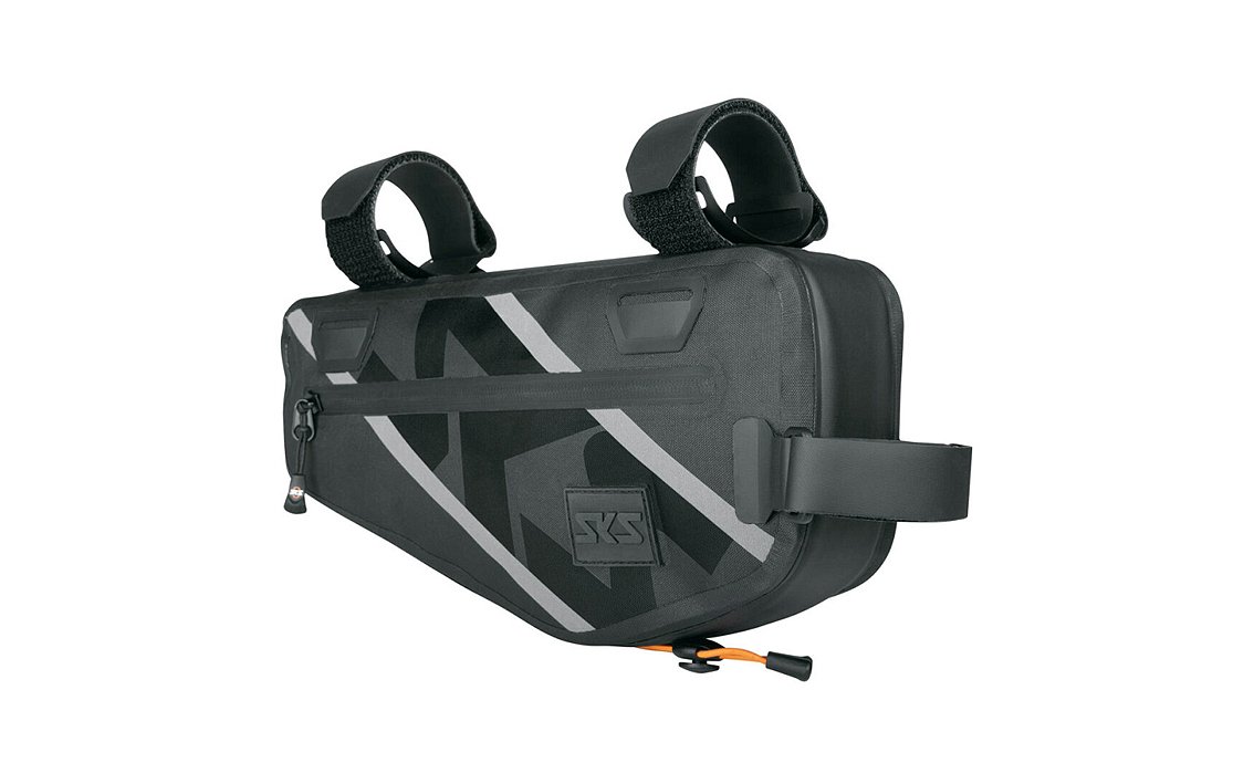 Thanks to the hook and loop fasteners with paint-friendly tube protection, the SKS frame bag can be flexibly adapted to the bike frame. The non-slip hook and loop fasteners are extra long, but can be easily shortened and replaced. The packing loop on the underside is particularly practical for mounting a mini pump, raincoat or muesli bar. Reflective stripes provide greater visibility even when out riding at dusk.