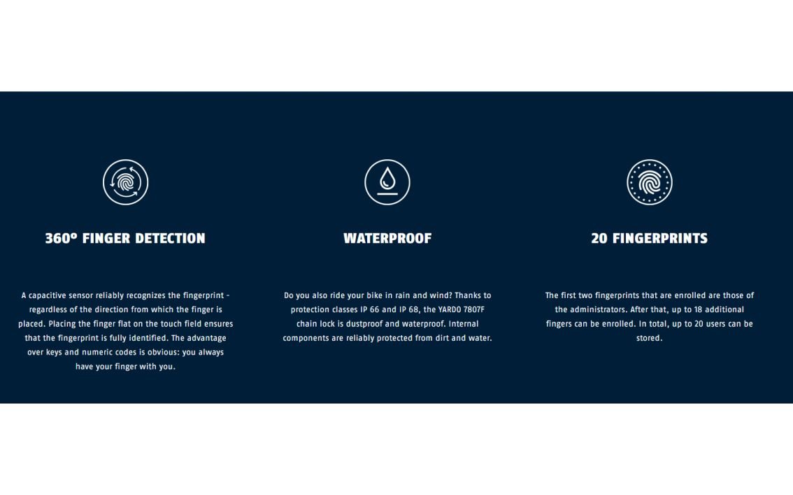 Innovative technology with a capacitive sensor on the chain lock ensures that you can open your bike lock without any keys or dials – using just your fingerprint.