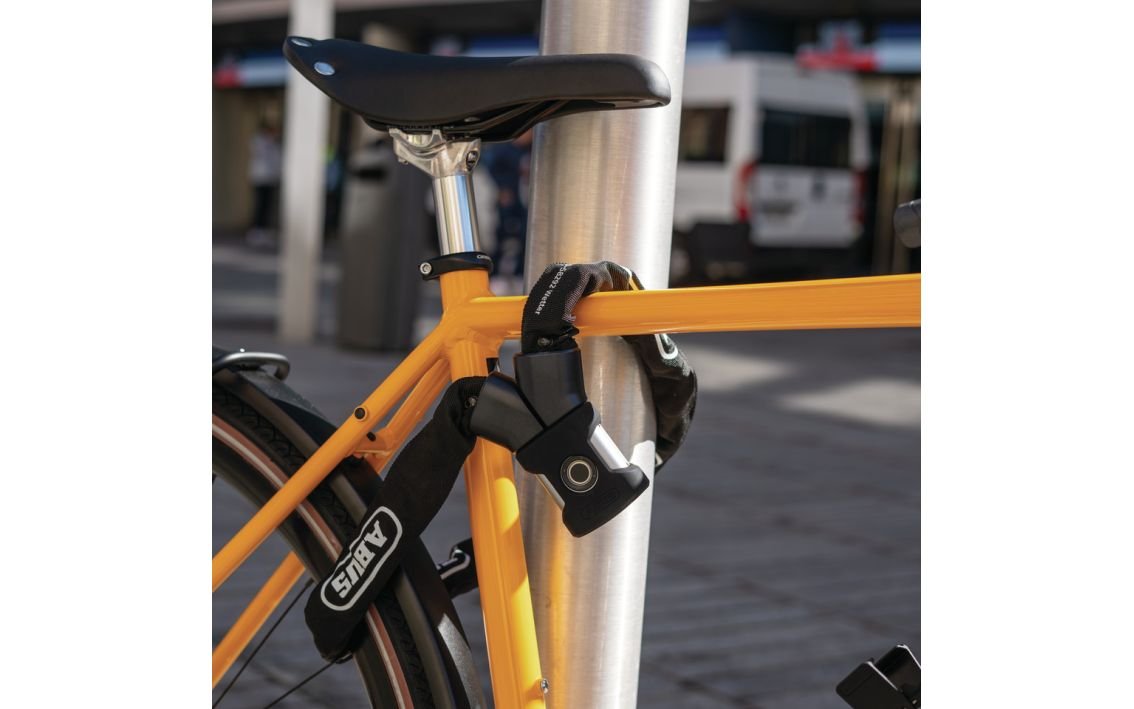 The lock body is encased in a silicone cover to prevent scratches on the bike frame. The IP66 and IP68 certification attests that the lock body is dustproof and weatherproof. A double ball bearing locking provides improved protection against forced opening.