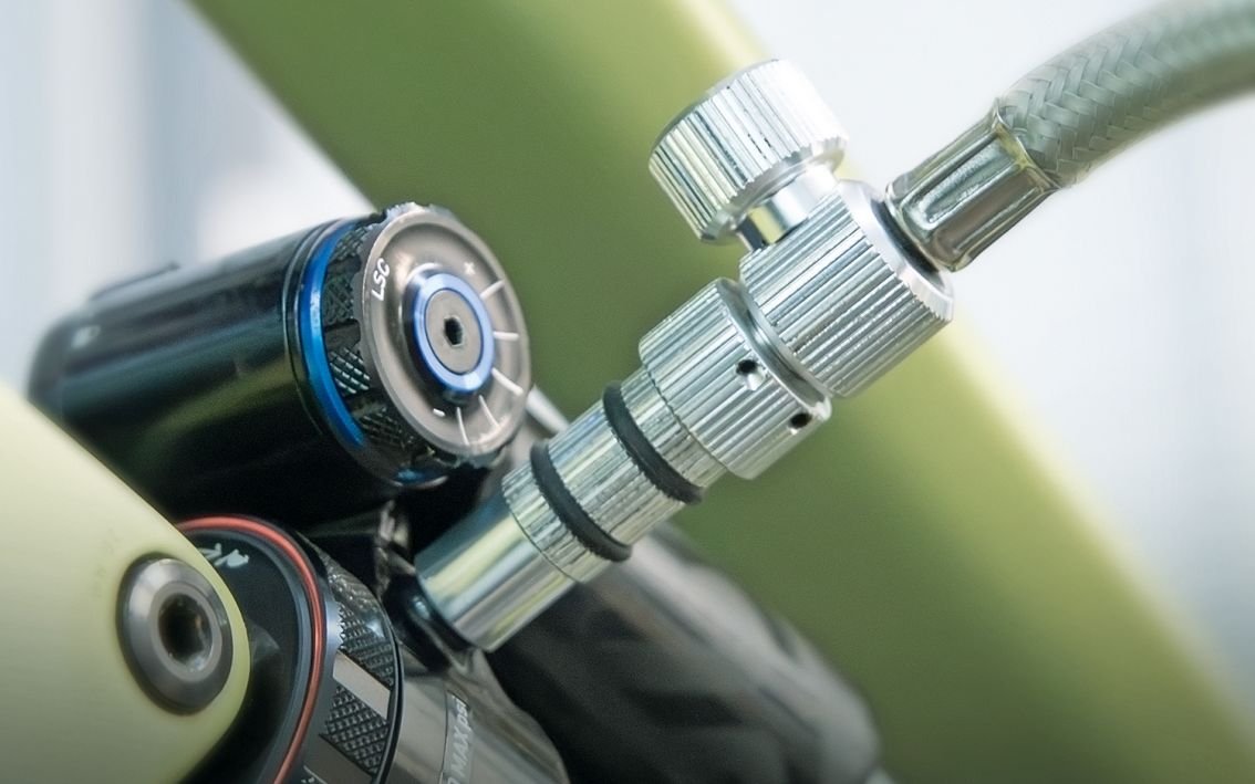 The RENNKOMPRESSOR SUSPENSION is a high-pressure suspension pump designed for precise adjustment of shock absorbers and suspension forks. With up to 400 PSI, a digital high-pressure gauge, fine-adjust knurled screw, and a secure 2-stage Schrader valve connection, it ensures accurate and loss-free inflation.